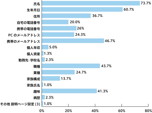 「氏名」73.7%が最も多く、次いで「生年月日」60.7%、「携帯のメールアドレス」46.7%と続いた。先月公開した「インターネットセキュリティーに関する調査(中)」の 中で、Webサイトへ入力するのに抵抗を感じる情報について「自宅の電話番号」(72.2%)や「住所」(64.8%)、「携帯の電話番号」 (54.9%)となり、個人情報として、入力することにユーザーが抵抗を感じていることがわかる。