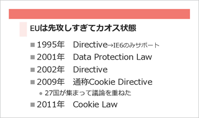 プライバシーについてのEUの取り組みは早く、1995年にディレクティブ(Directive:指令)が出たのを皮切りに、「Data Protection Law」や、いわゆる「Cookie Directive」を含めていくつかの指針が示された。これらを踏まえて議論は進んだが、「EUは結構カオス状態ですね」と清水氏は言う。それには「EU(European Union:欧州連合)」という28の異なる国を内包する経済連合体としての事情がある。