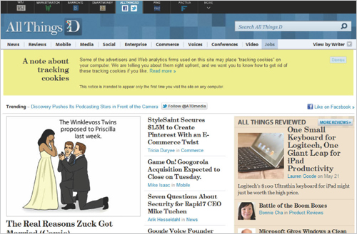 続いて清水氏は米国の例を紹介した。「All Things D」というサイトでは、初めて訪問したときにCookieを使ったトラッキングについての説明が表示される。「このサイトでは、サイトの表示と改善、関連度の高いコンテンツやサービス、広告表示のため、Cookieを利用しています。詳しくはこちら」。清水氏は「これはただのお知らせで(ICOのように)オプトインさせているわけではない。文字も小さいですし、訪問2回目以降は出てきません。アメリカの場合は現実路線でさりげなくやってます」と説明する。