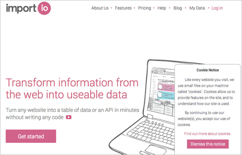 「import.io」というベンチャー系のサイトでは、初めて訪問すると右下に説明がポップアップ表示される。「他のほとんどのサイトと同様、サイトの実装と分析のためにCookieと呼ばれる小さなファイルを保存しますよ、という説明です。実際、CookieやJavaScriptがオフの場合、ほぼ使えないサイトが多い。これは見せ方もさりげないし、表現も柔らかい。ユーザー視点ですよね」