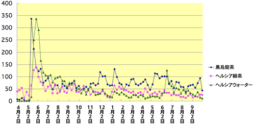 では、黒烏龍茶をヘルシア緑茶と比較してみる。ヘルシア緑茶はwikipediaによれば2003年に発売されたロングセラー商品なので単純に比較するわけにはいかないが、あえて比較をすると、ヘルシア緑茶のエントリー数は、ここ半年の間で平均50程度から徐々に下がっていて、黒ウーロン茶の話題量はおおむね100以上となっている(図2)。