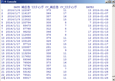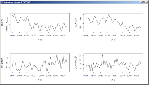グラフを書く時の関数plotで、#1で作成したDATE2をX軸に指定し(sample$DATE2)、Y軸には純広告(sample$純広告)を指定しています。