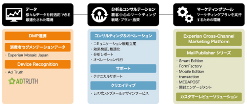 国内に専門チームを設置し、クロスチャネルマーケティングの最適化されたシナリオの設計から実行、管理、分析、そしてキャンペーンマネジメント・システムの導入から運用に至るまでをサポートする。このように技術の導入から施策の実行に至るまでをトータルでサポートする体制が、エクスペリアンジャパンの中にある。この点が、他ベンダーとは異なる。