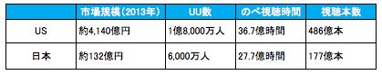 次に日米ユーザーの動画サイトでの滞在状況を見てみます。コムスコアが発表しているレポートによると、アメリカ全体で2014年1月時点で約1億8千万人ほどがオンライン動画サイトに滞在し、月間で1人当たり20時間ほどオンラインコンテンツ閲覧しているというデーターが出ています。