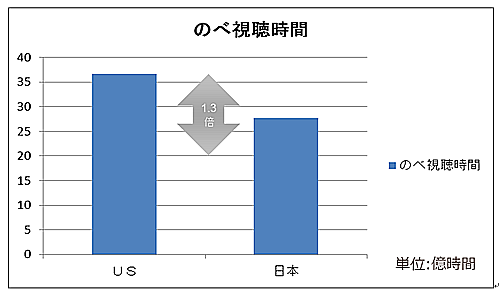 ここで注目したいのが、日米において月間で視聴されているビデオ数です。それを比較してみるとアメリカでは486億本、日本では177億本となります。一方、視聴されている時間数はアメリカでは36.7億時間、日本では27.7億時間ということがわかります。
