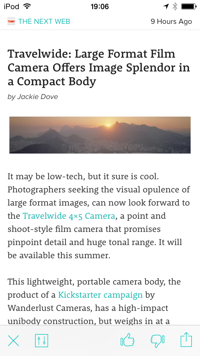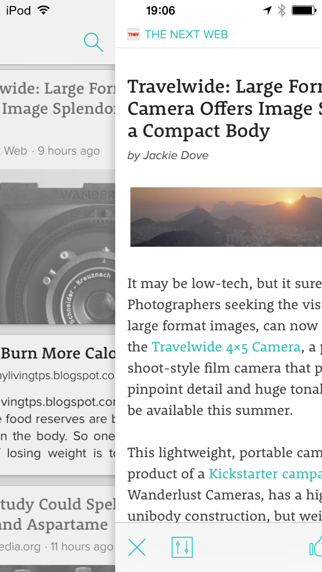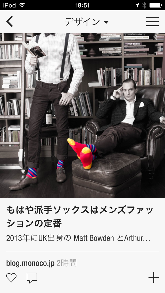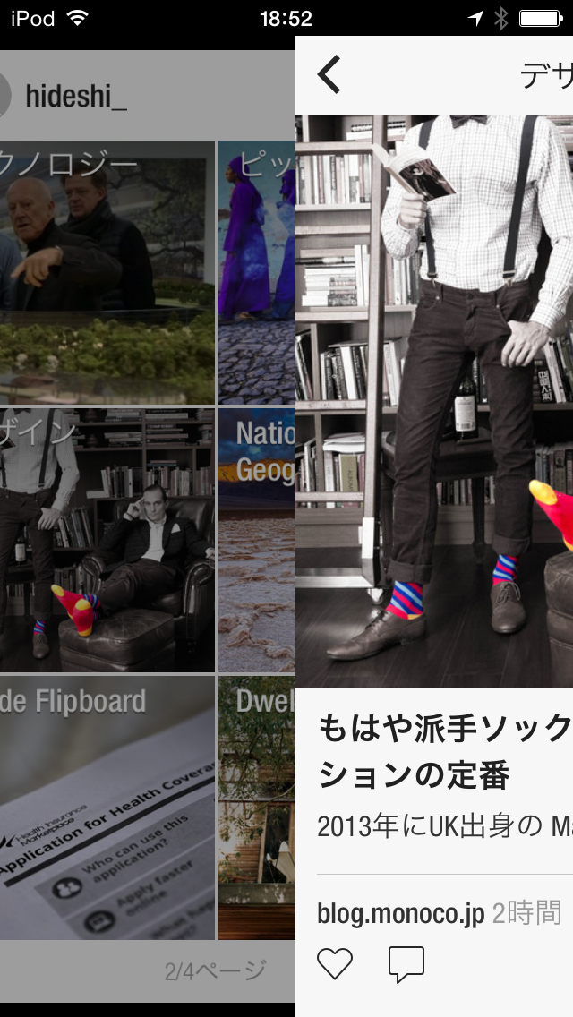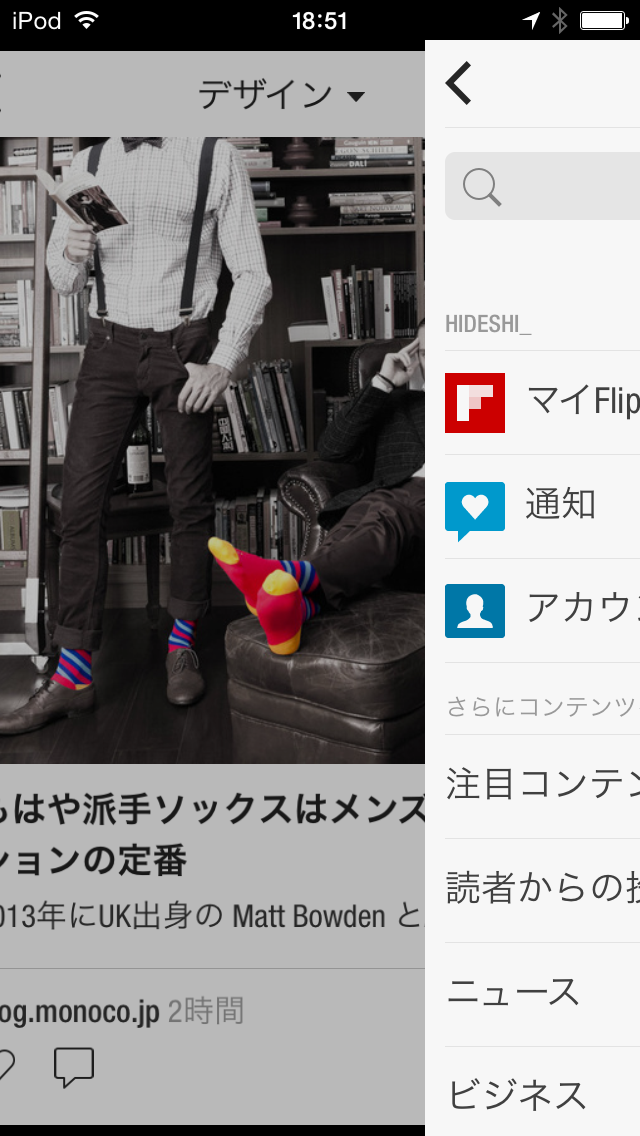 また、iOSアプリのFlipboardでは、同じく、左スライドで「戻る」を、右スライドで「スライドメニュー」を展開できます(なお、左スライドで「戻る」ことができるのはAndroidアプリでも同様です)。