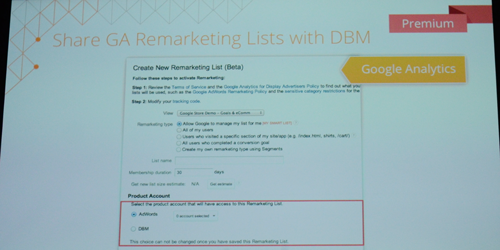 DBMの連携は、Google アナリティクスの「リマーケティング」の設定でチェックボックスにチェックを入れて共有することにより実現できる。これにより、Google アナリティクスで作成したリマーケティングリスト(リマーケティングのタイプは「スマートリスト」も選択可)をDBM上でも利用でき、広告出稿担当者はターゲットに対して自動的かつ効率的にコスト投下できるようになる。