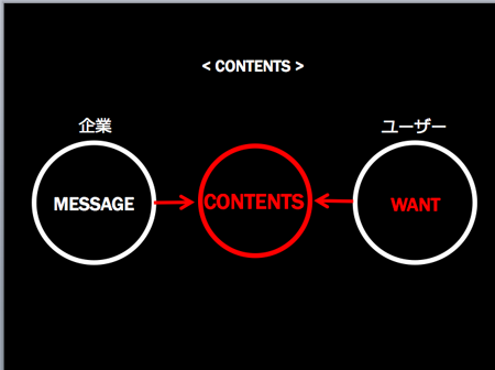 企業サイドの「メッセージ」とユーザー側の「求めるもの(見たいもの)」、それらの共通項を探し出しコンテンツを作り出すのが肝心です。