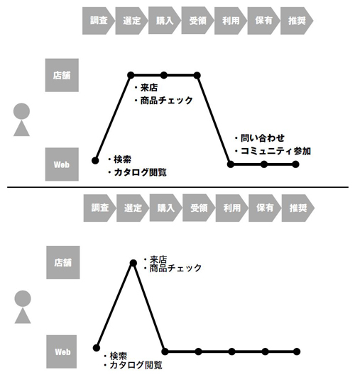 戦略を変えたのは2003年の秋頃です。当時実施したアンケートによると、オンラインショップ利用者の6割はオンラインでの購入経験がないと回答がありました。この人たちは何をしているのか調べたところ、51%は「事前に商品をチェックする」ためにサイトを訪れていました。購買行動は、店舗とオンラインショップを「行ったり来たり」しながら行われてることが分かったのです。