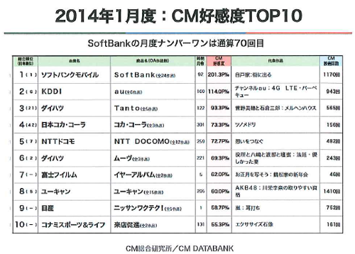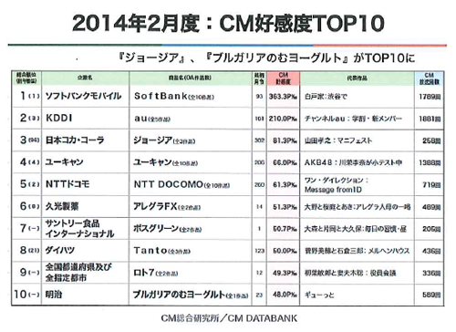 続いて、2014年2月度のCM好感度トップ10をみてみると、通信事業者やドリンク類が目立つ。そして同月は、携帯3社が学割商戦を繰り広げていた。