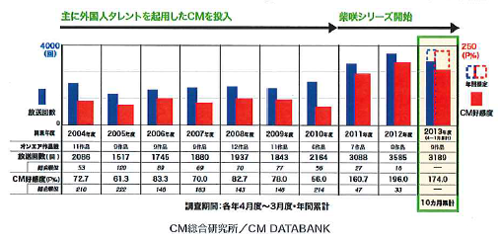 ハーゲンダッツは1961年にニューヨークで誕生した高級アイスクリームブランド。日本に参入したのは1984年で、日本初のCMは1991年から実施している。下記は直近10年間のCMの推移を示したグラフ。青いグラフは放送回数、赤いグラフがCM好感度を示しており、柴コウが起用され始めた2011年から、CM好感度がぐっと伸びている。