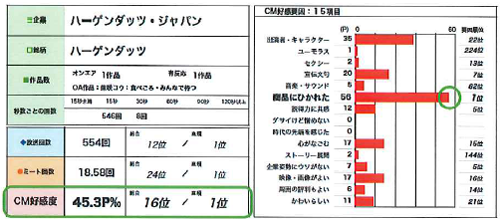このトップ10にはランクインしていないのだが、「商品にひかれた」ランキングで1位になったハーゲンダッツの事例を増崎氏は取り上げた。下図はハーゲンダッツの好感要因を赤いグラフで示したもの。このCMには柴咲コウが出演していたが、出演者の項目よりも、商品にひかれたポイントが非常に高いことがわかる。タレントが目立ちすぎずに、商品の魅力が伝わるCMに仕上がっているということだ。