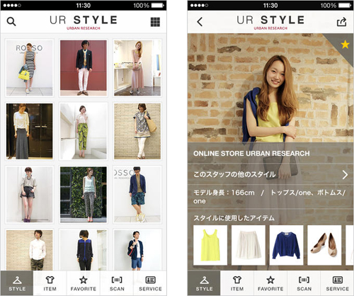 そんな中、いち早く成功の糸口を掴みつつあるのがアパレル大手Urban Research(UR)です。UR社では、販売員のコーディネート写真をアップロードし、独自アプリ、ブログ、FacebookやWEAR等のチャネルに掲載する仕組みを2013年5月から提供。利用者は性別やキーワード検索などで自分の好みにあったコーディネートを探して、そのままECサイトや店舗で購入できる仕組みです。
