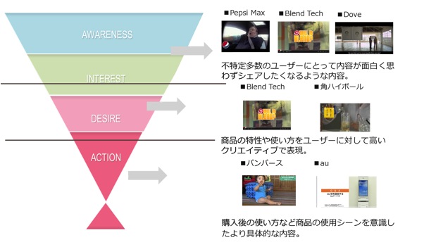 次にブランデット動画のクリエイティブを、消費者行動モデルから考えてみたいと思います。AISAS理論、コンシューマー・デシジョン・ジャーニーなどさまざまなモデルがありますが、今回はAIDMAの法則に従って解説します。