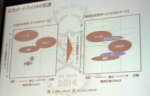 つまり現在の状況としては、まだオフラインの広告のほうが投資額としては多いのですが、ユーザーが接触するメディアとしてぐっと伸びているスマートフォンへの広告が比率としてはあがっています。