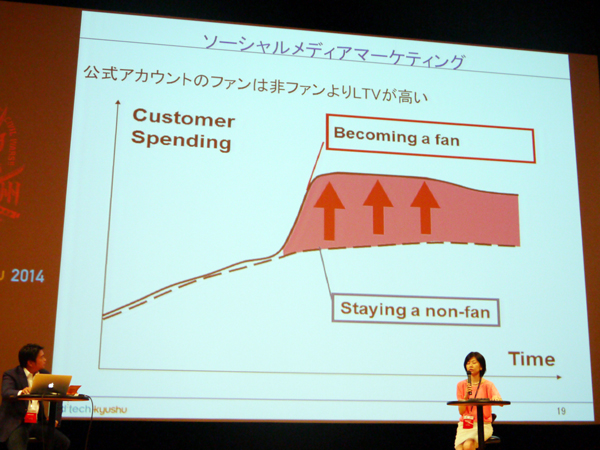 ここで田島氏は、間接貢献の事例を提示する。「ソーシャルメディアと楽天IDをリンクケージしたカスタマーのデータ分析を行ったところ、Facebookページのいいね!を押しているファン、Twitterのフォロワー、そしてLINEの友だちになってくださっている方々は、非ファンの方々よりも、LTVが高いことがわかりました。つまり、ソーシャル会員は年間購買金額がある一定量高いことが明らかになったのです。これにより、ファン化することで間接的に売上に貢献することが見えてきたのです」