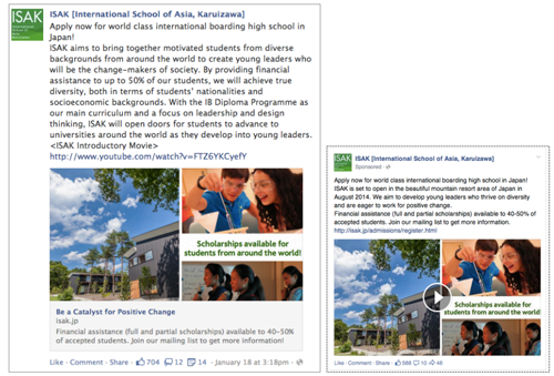 そこでまずはFacebookページを通して、ISAKに興味を持ってくださっている方たちに対して情報を発信していくことから始めました。どんなコンテンツが刺さるのかをFacebookページへの投稿でテストし、少しずつページポスト広告の施策と実績を積み重ねていきました。その小さく重ねてきた実績から、広告効果が見込めると判断ができたので、本番の生徒募集の際には通常よりも予算を大きく投下し、WebマーケティングについてはFacebook広告一本で施策を行いました」
