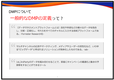 簗島氏の講演は「DMP」という言葉の定義からはじまった。DMPの定義は様々だが、共通していえるのは「ユーザーのデータを解析してマーケティング目的に活用する」という点だという。