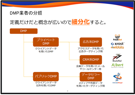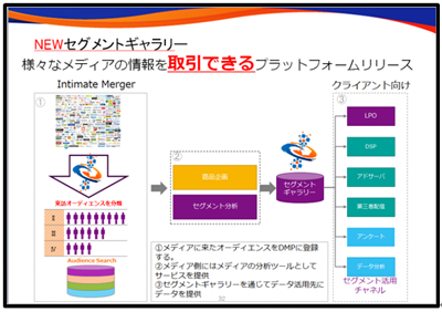 現在の市場で提供されているDMPは、企業が自社内に保有する属性情報を活用する「プライベートDMP」と、アドネットワーク等を通じて第三者から取得した属性情報を活用する「パブリックDMP」に大別される。簗島氏は、Intimate Mergerを「パブリックDMPのなかの『データセラーDMP』」と位置付けた。