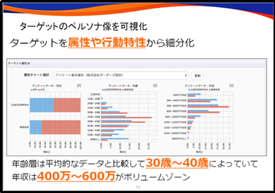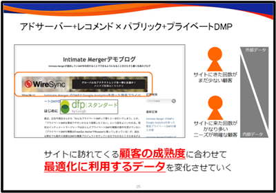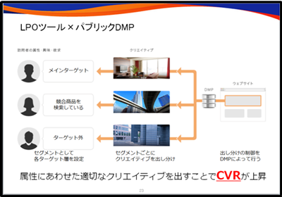 次に、簗島氏はDMPの活用事例を順番に説明。ネットリサーチと提携することで顧客がターゲットとなる層に対して直接アプローチしてヒアリングを行うこと、LPOツールと連携して属性に適したクリエイティブを出しわけること、アドサーバー・レコメンド・プライベートDMPと連携することでサイトに訪問する顧客の成熟度(ロイヤリティ)に応じてメッセージを最適化させることなど、具体的な活用方法が紹介された。
