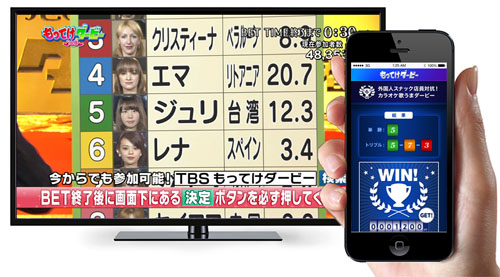2014年春放送のTBS特番「ミッドナイト感謝祭!もってけダービー'14春」では視聴者参加型のダービーを実施しました。CMのタイミングに合わせて視聴者の手元にある端末の画面を切り替え、CMの内容にかかわるクイズ形式のアンケートを実施。CMの商品を知っていたかどうか、あるいはCM内容についての簡単な質問などを行いました。視聴者が回答すると番組本編で使用可能な、スポンサー名義のボーナスポイントを獲得できるという仕組みです。