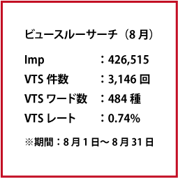 配信したインプレッションに対してVTS件数が3,146回を記録しており、VTSが発生したワード数については484種類、インプレッションからVTSされる確率を表したビュースルーサーチレート(以下VTSR)は0.74%という数値が出ています。