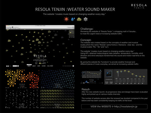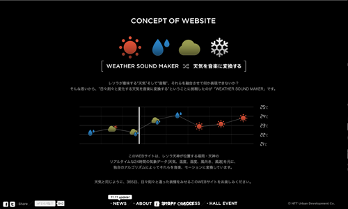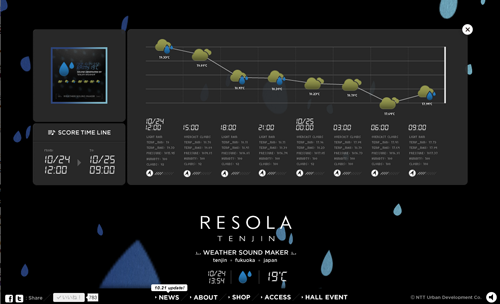 仕組み的には、アクセスする度に、レソラ天神が位置する福岡・天神のリアルタイムな気象データをAPIから取得し、そこから24時間の天気の移り変わりや気温の上昇、風速や風向きをサウンドとモーションに変換しトップページで表現するというもの。