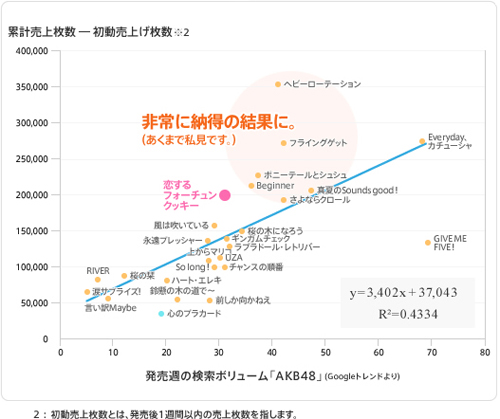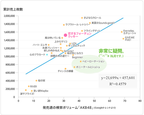 まず、「バズっているかどうか?」の代理変数として「AKB48の検索ボリューム」を使います。さらに「楽曲の認知/浸透度」の代理変数として「売上枚数」を使用してみましょう。代理変数というのは、直接計測することができない量の代わりになる変数のことです。AKB48について日本国民全員でどれだけ話題にされているかを直接計測することは難しいでしょう。一人ひとりに聞いていては今のメンバー全員卒業してしまいます!!!