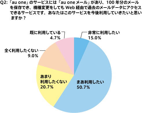 「非常に利用したい」と「まあ利用したい」を合わせると「au oneメール」のサービス利用意向は65.7%にのぼり、非常に高いと言えるのではないだろうか。