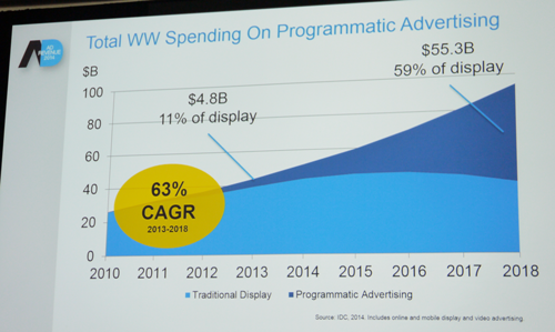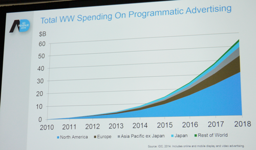 これは世界のプログラマティック広告の総広告費だ。オンラインビデオ、ディスプレイ、モバイルなど全てをトータルしたものだが、このグラフを見てわかるように、大きな成長が見込まれている。このグラフで注目すべき点は2つある。1点目は、現状では従来のディスプレイ広告の10分の1程度しか、プログラマテック化されていないということだ。だが、数年後には逆転している。つまり、ここ数年間で非常に大きな変化が起きるということがわかるだろう。2013年から2018年まで、プログラマティックは毎年60%を超える成長率で伸長していく(CAGR:63%/2013-2018)。