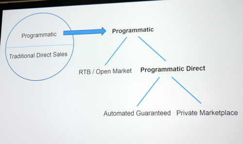 そもそも“Programmatic”とは、ソフトウェアを使って、広告取引を自動化し、オペレーションを円滑にやっていくものだ。プログラマティックは、「RTB/Open Market」と、クローズドな「Progrrammatic Direct」の大きく2つに分けられる。さらに「Progrrammatic Direct」は、「Private Marketplace(広告主と媒体社がクローズドなマーケットで1対1でRTB取引を行う仕組み)」と、「Automated Guaranteed(固定単価での予約購入を自動で行う取引)」に分類される。(詳しい用語解説はこちらをご参考に)