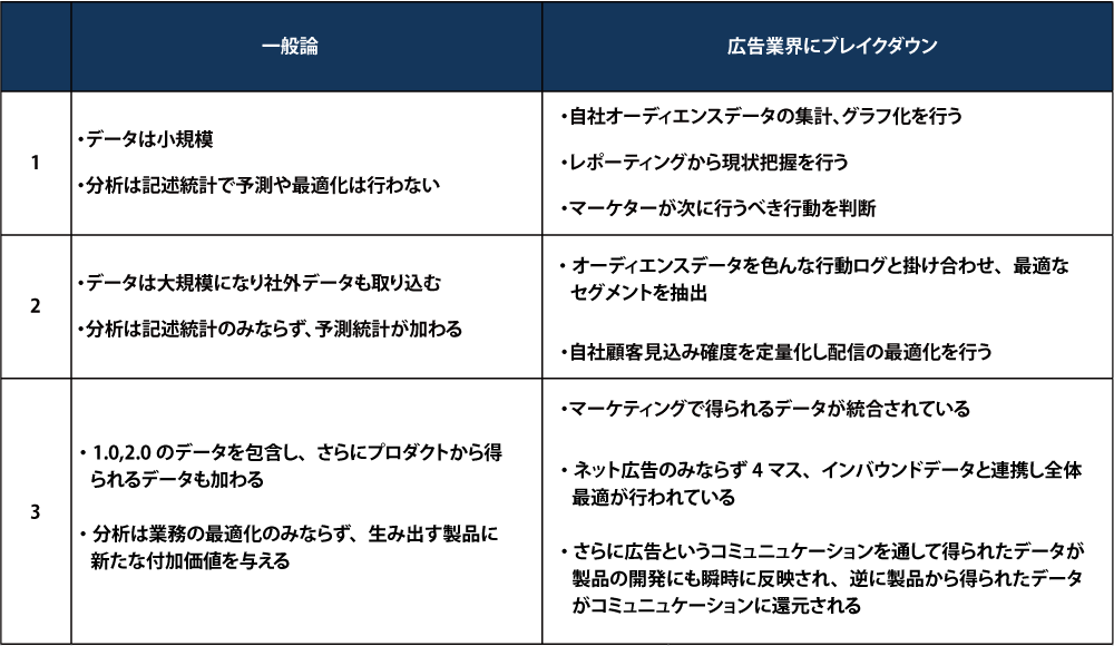 3.0は2014年現在まだ全容は明らかではないが簡潔に述べると、社内外からデータを集約し、企業が業務プロセスのみならず、自社製品にデータ分析が適用され最適化される段階だ。広告業界に照らし合わせると、ネット広告に限らず4マスやインバウンド全てのデータが統合され、そこから得られるデータが企業製品に対して何らかの付加価値を与える。そしてその製品から得られたデータが再度広告コミュニケーションに瞬時に還元されるといったところだろう。