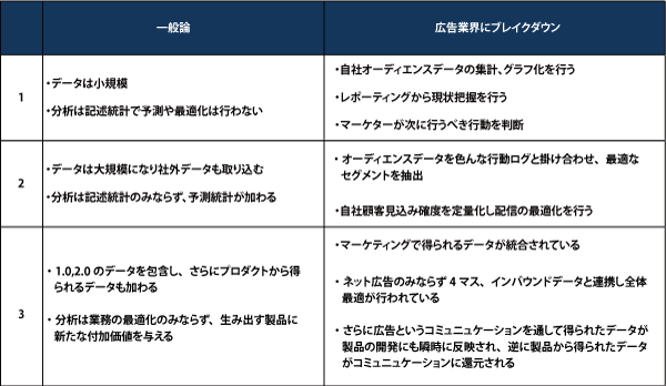 ビッグデータの大家であるトーマス・H・ダベンポート氏はデータ分析には3つのフェーズ(1.0、2.0、3.0)があると述べている。データと分析という観点から3つのフェーズを要約し、さらに広告業界にブレイクダウンしたものが次の図だ。
