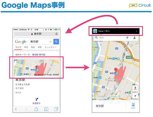 Google Mapsアプリが起動し、東京駅の該当箇所が紐付いたままアプリが開きます。Safariへ戻る導線があることでユーザーはスムーズにSafariへ戻ることが可能です。