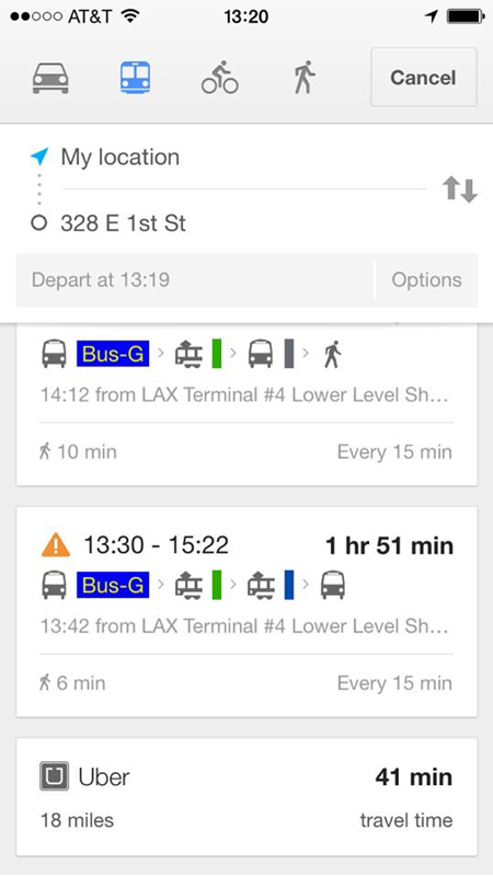 アメリカでGoogle Mapsをルート案内で利用すると、サジェスト結果にタクシー配車サービスUberが表示されています。サジェスト結果に表示されたUberをタップすると、Uberアプリが立ち上がりすぐに予約することが可能となります。