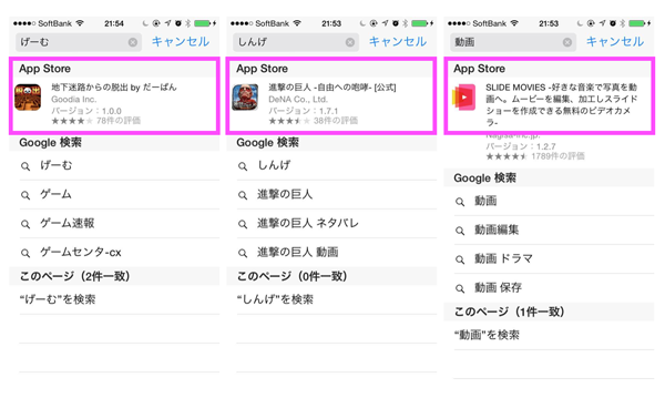 iOS8にバージョンアップ後、Safariブラウザの検索窓上でキーワードを打ち込んだ際、キーワードによってはApp Store上のアプリがサジェストされるようになりました。今まではGoogle検索結果が表示されていた箇所の上部にアプリが表示されることで、Web上で検索を試みるユーザーに対して直接App Store上の該当アプリページヘの導線を用意した形になります。