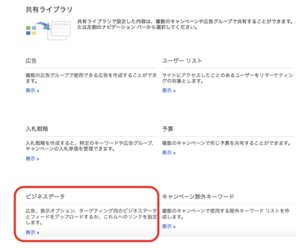 この動的リマーケティングの開放に合わせて、AdWordsの管理画面の「共有ライブラリ」に「ビジネスデータ」という項目が新設されました。今後、AdWordsでデータフィード広告を掲載する場合、このビジネスデータを利用することになります。