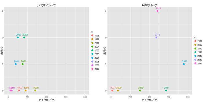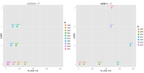 一方、AKBはAKB48単独で2011年に600万枚に迫る売上枚数を叩き出しました。2012年にはSKE48も加わり約750万枚ものセールスを記録します。その後は、NMB48、HKT48が加わりAKB48の落ち込み分を他ユニットでカバーしグループ全体の売上枚数としては400万枚後半を維持しています(株式投資の分散投資とちょっと似ている気がします。投資対象を分散させて収益率を安定させる、みたいな)。