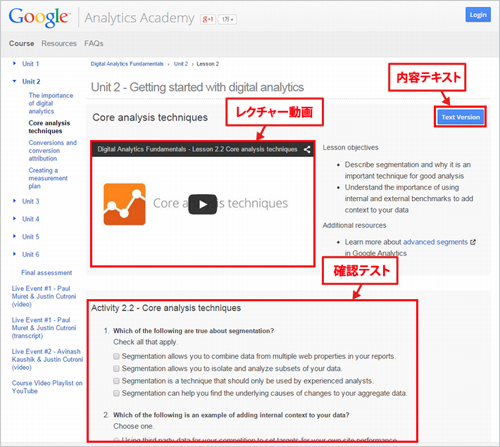 それぞれのコースは複数のUnit(ユニット)で構成されており、学習はこのユニット単位で進められます。各ユニットは「講師のレクチャー動画」「レクチャー内容のテキスト(PDF)」「確認テスト」で構成されており、テストで理解度を確認しながら進められる仕組みになっています。