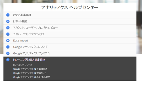 ヘルプは学習用コンテンツというよりは実際に利用しているときに用語の意味や機能の仕様を確認すために用いられることが多いものですが、GAIQ学習用としても非常に有益です。ただし、学習用に順序立てて体系的にコンテンツメニューが組み立てられているわけではなく、実用的な情報も多く盛り込まれているため、そのままでは効率的な学習には向きません。