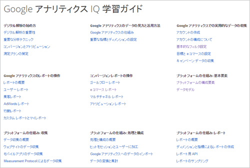 この「Google アナリティクス IQ 学習ガイド」は、まさにGAIQ学習者向けに「学習トピック」ごとにヘルプ内の関連ページへのリンクがまとめられている、「学習のためのリンクポータル」と言える内容になっています。各学習トピックには前述のアナリティクスアカデミーの該当ユニットへのリンクも記載されているので、体系的・網羅的に学習するには最適なものであると言えます。