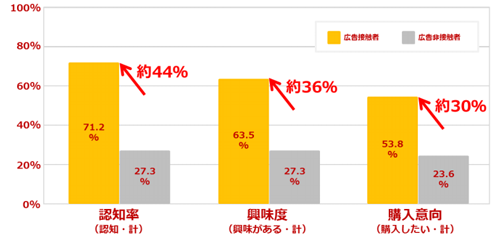 そしてこのネイティブ型コンテンツアドを活用した施策のブランドリフト調査も実施した。Glittyに掲載された記事広告の接触者と非接触者で、「認知度」「興味度」の態度変容を調査したところ、いずれも認知度は約44%、興味度は約36%、購入意向は約30%ほど接触者のほうが高いという結果が明らかになった。