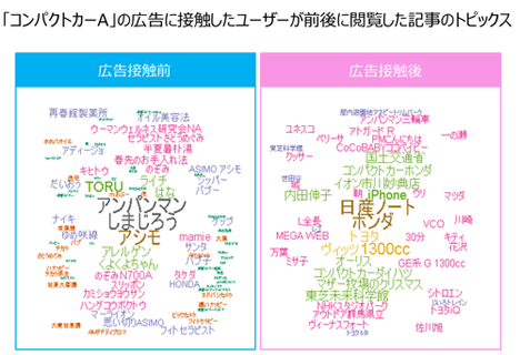 下の図は、あるユーザーが「コンパクトカーA」の広告への接触前後で、どのようなトピックの記事を閲覧していたかをキーワードベースで可視化したものである。クリックやコンバージョンなどの直接的な成果の有無にかかわらず、広告の接触後には車やそれに付随するトピックスの記事の閲覧回数が増えていることがわかる。