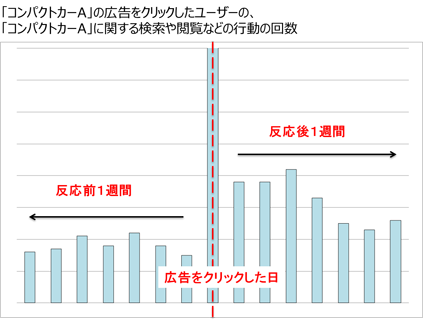 また、下の図は、実際に「コンパクトカーA」の広告をクリックしたユーザーの、クリック前後の一週間における「コンパクトカーA」に関する検索や閲覧などの行動の回数を表している。クリック前と比較して、クリック後は関心の高まっている状態が1週間ほど続いている様子がうかがえる。
