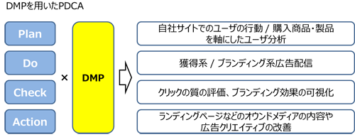 DMPを用いたPDCAをまとめると以下の図のようになる。DMPのデータを活用してPDCAの精度をあげ、広告配信施策を最適化することができる。
