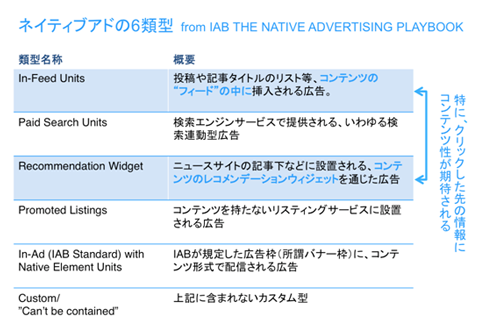 ではここで、具体的なネイティブアドの具体例を見ていきましょう。大きく整理すると、IABが提唱する6分類に分けることができます。(参考:DAC提供のIAB「ネイティブアド・プレイブック(日本語版)」はこちら)