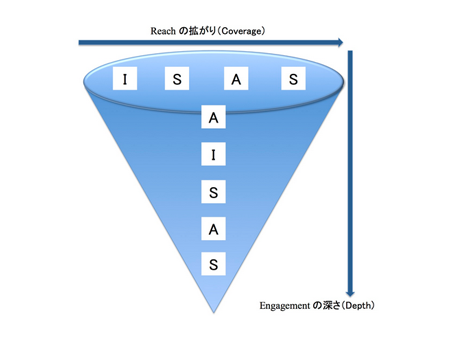 ヨコに「I」「S」「A」「S」と並べて、この一連の流れが、機能不全を起こしたAttentionを補う役割を果たす。拡散することで、リーチが拡がっていく。これがうまくいけば、「Attention, Please!」と一方的に大声で呼びかけるマス広告的手法が機能しなくても、なんとかなるかもしれない。ターゲットの人々のInterestに沿った情報提供に成功すれば、リーチが拡がっていくからだ。