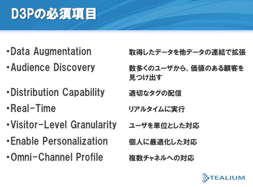 これができるのは、Tealiumの立場がニュートラルだからです。似たような機能を持っているところはありますが、DSPの付随サービスとして提供されているようなタグマネジメントでは、そのベンダーの競合とあたるサービスにデータを渡せるかというと、何かしらの制約があります。その制約をお客さまは嫌がるわけです。