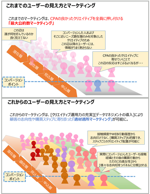 その先にあるのは、ユーザーの捉え方、アプローチの仕方の変革だ。これまでのようにCPAの良かったクリエイティブを、どんなユーザーにもぶつけてしまう「最大公約数マーケティング」から、顧客の志向性や購買ステップに寄り添った「適材適所マーケティング」へと進化していくことが可能になる。