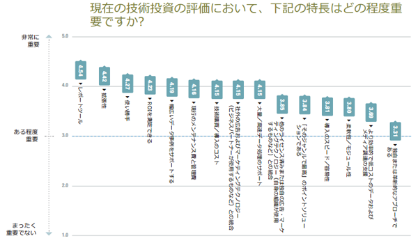 ユーザーは依然としてレポート機能をプラットフォームの価値の重要な指標と考えているようだが、全体的なレポート機能の向上の結果、その相対的重要性は将来的に徐々に低くなっていくだろう。また、データテクノロジーの数が急増したことで、マーケターはこれらの独立したツールセットの統合にいっそう熱心に集中するようになった。